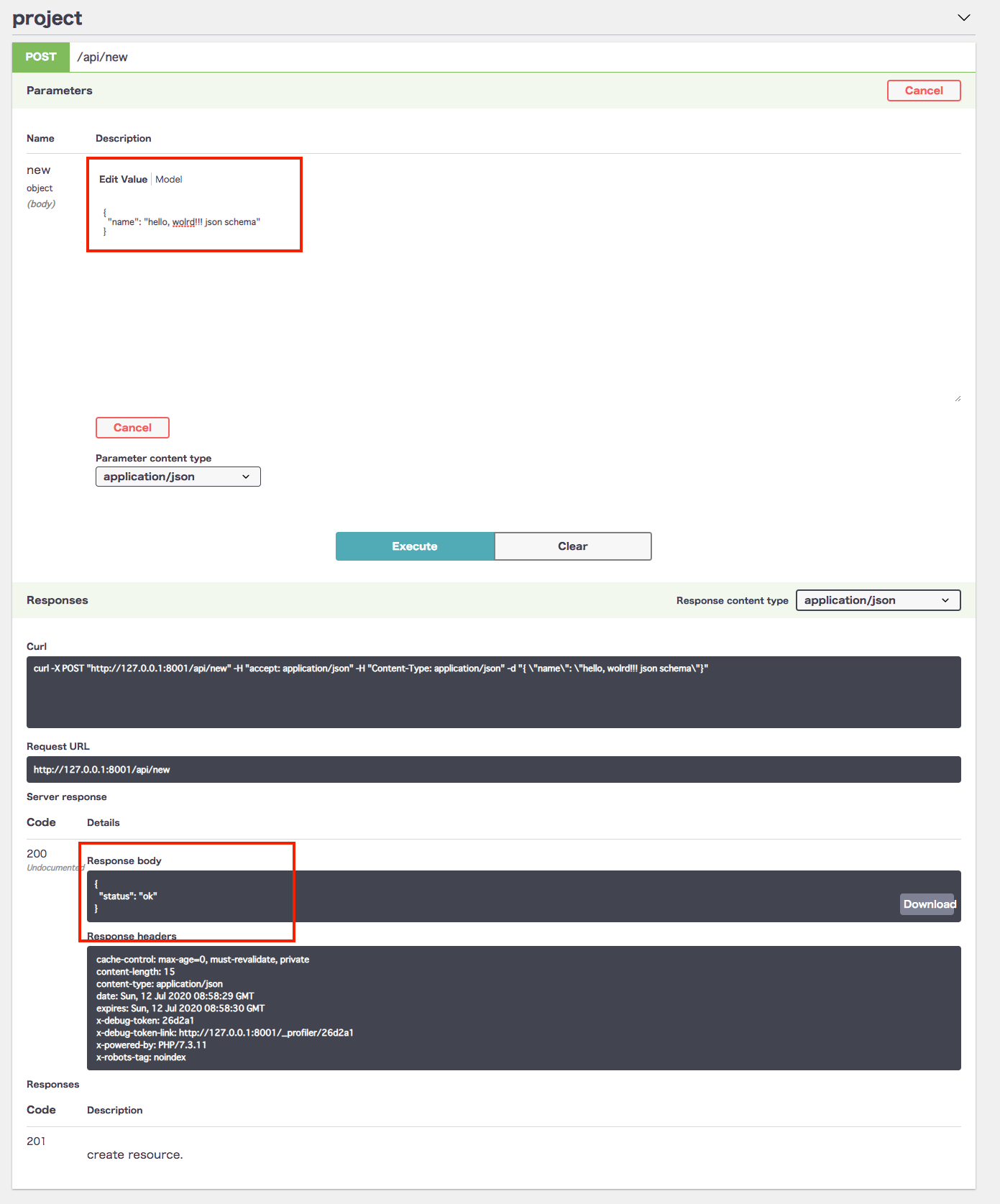 キャプチャ画像で成功するリクエストと、バリデーションエラーになる実行結果を用意しました。