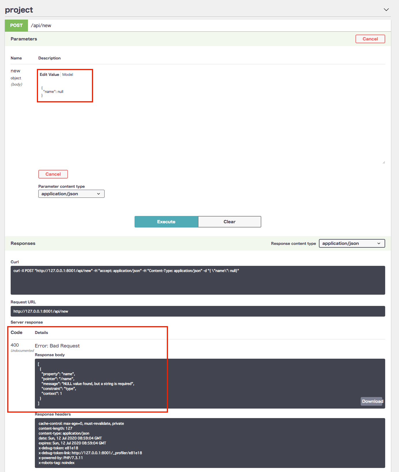/api/doc から試しにバリデーションが実行されるか確認してみましょう。