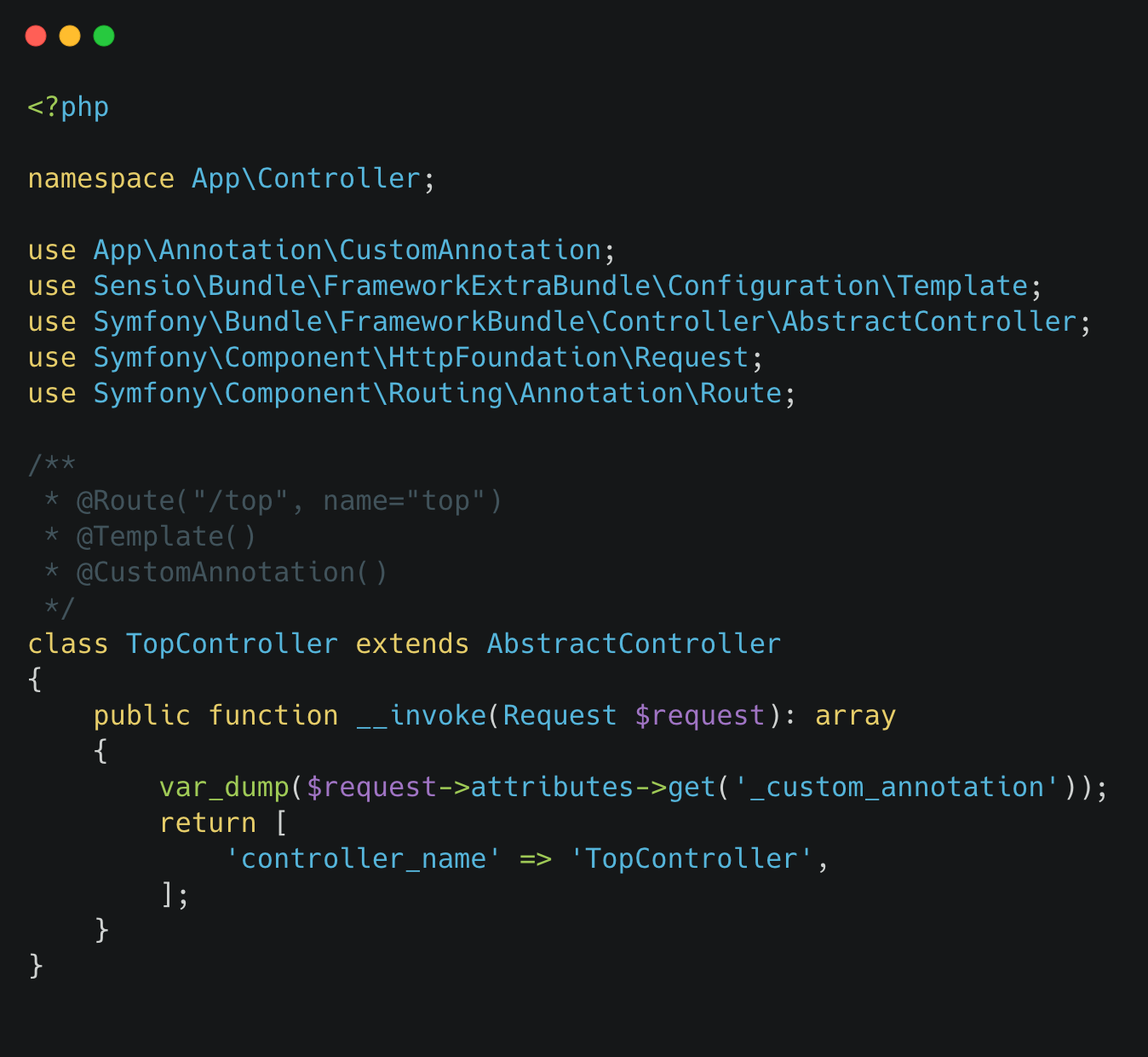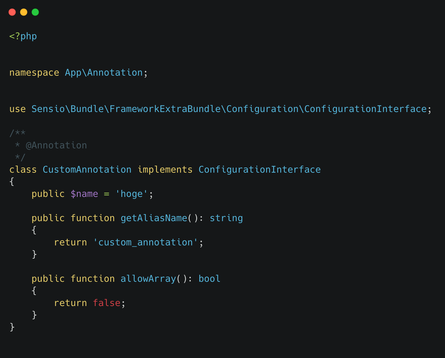 (え?Routeアノテーションは??って思っている人がいるかも知れませんが、ここでポイントなのは ConfigurationInterface をもつAnnotationを解析するのでRouteアノテーションはここでは処理されないんですよね。)