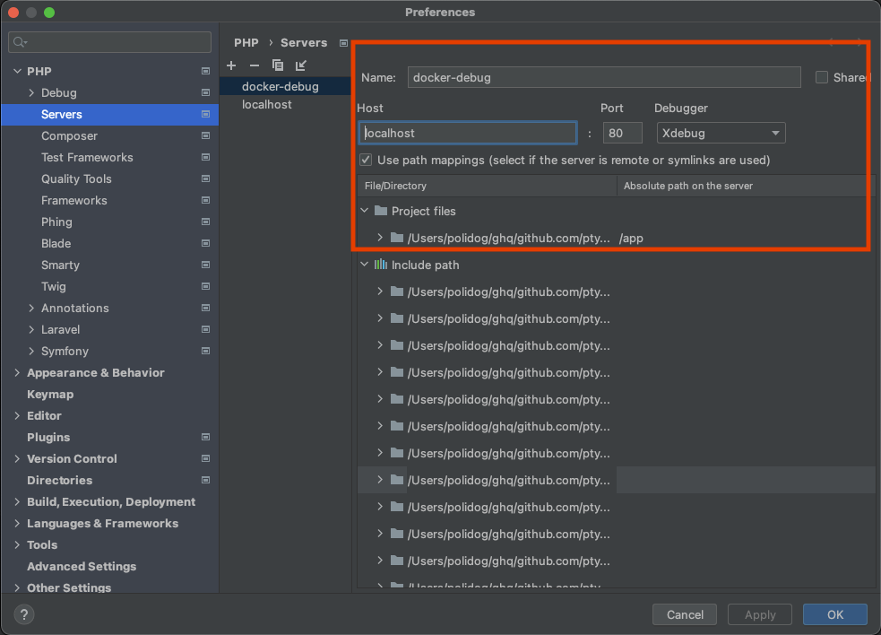 Setting -> PHP -> Serversでlocalhost, 80, でProject FilesのAbsolute path on the serverパスに /app を設定する